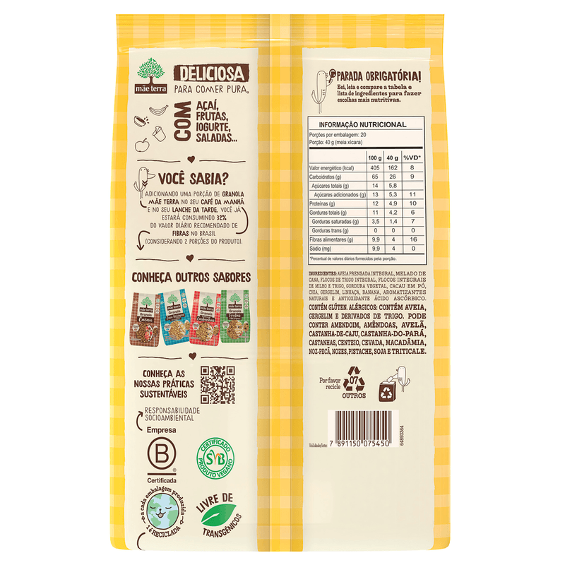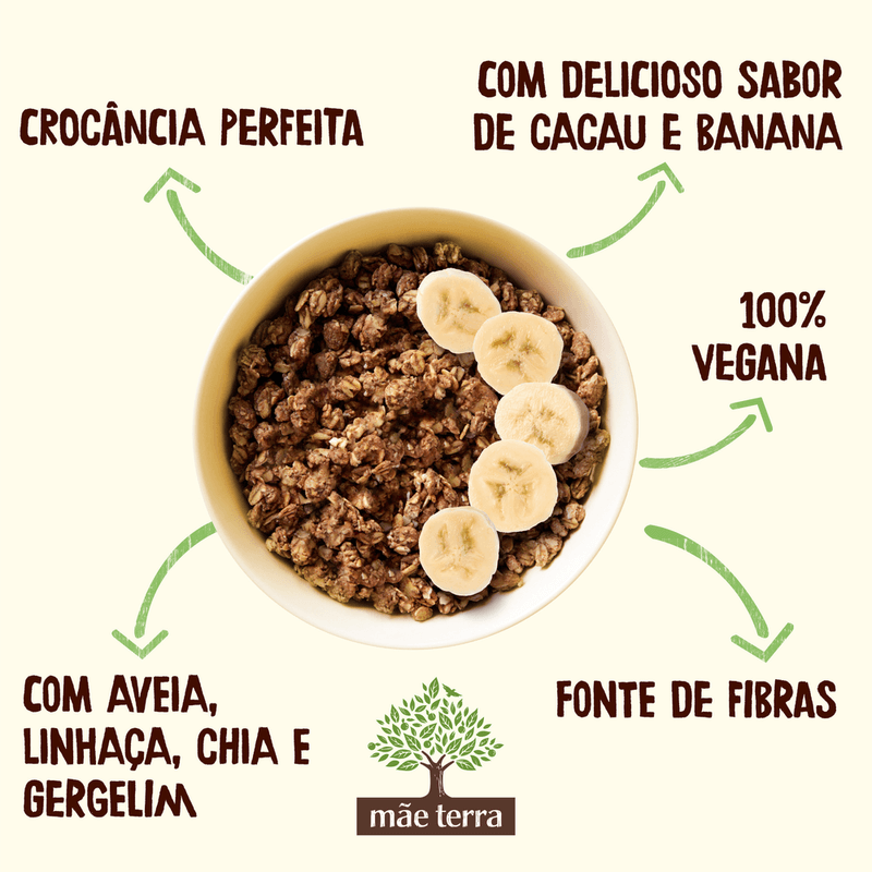 • A Granola Mãe Terra é super crocante e tem o gostinho delicioso de banana e cacau • Comece seu dia com um café da manhã saudável e gostoso. A Granola Mãe Terra Banana e Cacau é fonte de fibras e pode ser adicionada em iogurtes, leites, bebidas vegetais ou onde preferir • Apaixonados por granola de verdade desde 1979. Produzimos com afeto alimentos saudáveis, privilegiando os pequenos produtores e valorizando os ingredientes nativos do Brasil • Feita com grãos integrais, dentre eles aveia, linhaça, gergelim e chia. Com ingredientes nativos do Brasil, livre de transgênicos e pozinhos artificiais • A Granola Mãe Terra Banana e Cacau é 100% vegana, feita com ingredientes naturais, fonte de fibras, e sem ingredientes geneticamente modificados • Nós, mãe-terráqueos, acreditamos que a mudança começa pelo nosso prato. Por isso, temos paixão em fazer produtos naturais, saudáveis e orgânicos que mudam o corpo, a alma e a nossa mãe Terra. Nossa Granola Mãe Terra Banana e Cacau é feita com cereais e sementes integrais, banana, cacau e o nosso jeitinho mãe terráqueo de preparar uma granola gostosa, saudável e nutritiva! Além de ser crocante, deliciosa e vegana, esta granola é fonte de fibras. Ela é feita com grãos integrais, como aveia, linhaça, gergelim e chia. Com ingredientes nativos do Brasil, livre de transgênicos e pozinhos artificiais. Use e abuse para um café da manhã saudável com iogurtes, leites ou bebidas vegetais; misture em açaís, sorvetes, ou coma puro quando bater uma fome durante o dia! De qualquer jeito, é sensacional! Fundada em 1979, a Mãe Terra é líder no segmento de alimentos naturais e orgânicos no Brasil. E é com muita alegria que podemos dizer que somos uma Empresa B, comunidade global de organizações que buscam o desenvolvimento socioambiental, além de econômico. Temos o desafio de crescer, mas sempre respeitando os limites da natureza, valorizando a preservação ambiental e com cuidado social. Ser parte desse movimento nos mostra que estamos no caminho certo. Afinal, tem que valer a pena levantar cedo. Nós, mãe-terráqueos, acreditamos que a mudança começa pelo nosso prato. Por isso, temos paixão em produzir alimentos naturais e orgânicos que mudam o corpo, a alma e a nossa mãe Terra. Os 7 princípios da Mãe Terra são: 1. Alimentos gostosos, feitos com afeto; 2. Integral de verdade, naturalmente nutritiva; 3. Orgânicos, cada vez mais; 4. Livres de transgênicos e pozinhos artificiais; 5. Privilegiando os pequenos produtores; 6. Valorizando os ingredientes nativos do nosso Brasil; 7. Vegana, aqui só tem ingredientes vegetais. Sabemos que não somos perfeitos, mas nos esforçamos para fazer nossa parte. Vamos juntes? #AlimenteaMudança