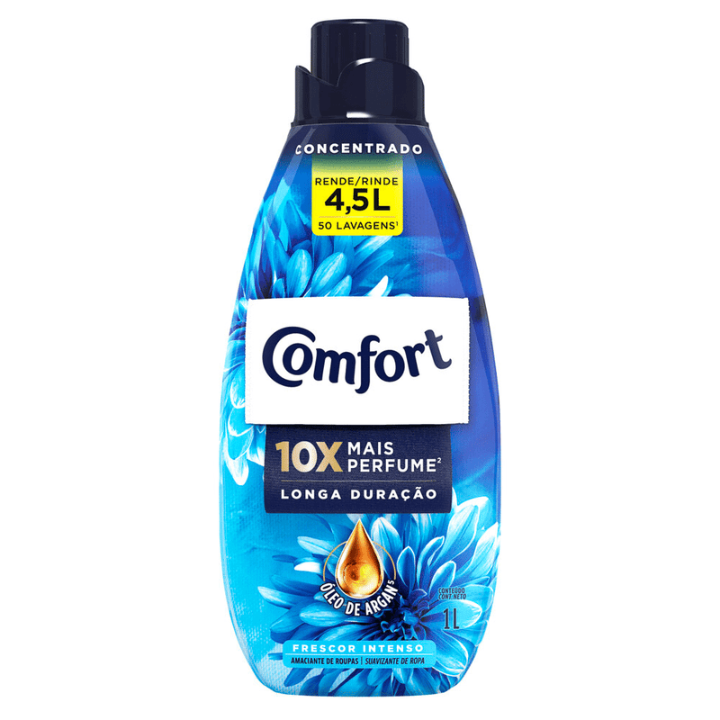 • O Amaciante Concentrado Comfort Frescor Intenso possui óleo de argan*****, que cuida intensamente das suas roupas enquanto as perfuma por muito tempo
