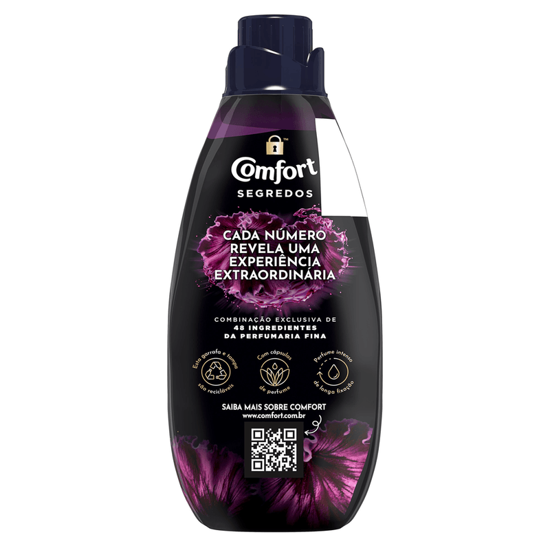 • Os amaciantes de roupas Comfort Segredos possuem perfumes misteriosos que se mantêm em suas roupas por muito tempo • O Amaciante Concentrado Comfort Segredos 48 possui um perfume para roupas de longa fixação, para que fiquem sempre perfumadas • Comfort Segredos é um amaciante de roupas concentrado que possui uma combinação exclusiva de 48 ingredientes da perfumaria fina • Além do cuidado de Comfort em suas roupas, este amaciante é o segredo para uma experiência olfativa sofisticada e marcante • Comfort Segredos: cada perfume guarda um mistério. Descubra o seu! • Você sabia que a garrafa e tampa desse amaciante são feitas com plástico reciclado e reciclável? É por isso que nossa garrafa é cinza! O novo Comfort Segredos concentrado possui perfumes misteriosos, e o único spoiler dessas variantes são somente dois números: 36 e 48. O Amaciante Concentrado Comfort Segredos 48 reúne a combinação exclusiva de 48 ingredientes da perfumaria fina, que garantem uma fragrância sofisticada e marcante. Cada número revela uma experiência olfativa instigante, que convida você a fazer sua própria interpretação das fragrâncias. O amaciante de roupas Comfort Segredos garante longa fixação dos perfumes, para que suas roupas fiquem perfumadas por muito mais tempo. Além de cuidar e fixar o perfume em suas roupas, o amaciante Comfort Segredos cuida do meio ambiente, pois além de ser concentrado, sua garrafa e tampa são feitas de plástico reciclado e reciclável. Faça o descarte consciente. Com o amaciante Comfort, suas roupas ficam livres de bolinhas e conservam a sua forma e cor. Comfort concentrado possui perfume encapsulado que penetra no tecido durante o processo de lavagem de roupa, deixando-a muito mais cheirosa até mesmo depois de seca! O motivo? Quando você se movimenta, essas cápsulas de perfume se rompem e liberam essa fragrância misteriosa e incrível, fazendo com que aquele cheiro de perfumaria fina dure muito mais. Impossível não querer descobrir o segredo dos perfumes que nunca acabam!