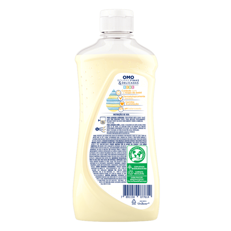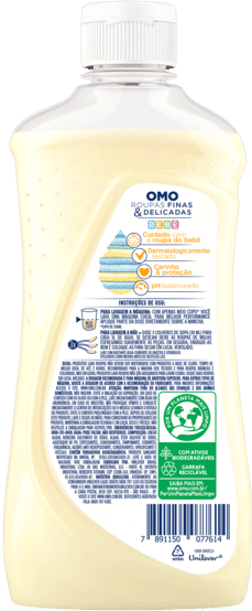 • O Sabão Líquido OMO Roupas Finas e Delicadas é imbatível no cuidado com as roupas* e cuida do meio ambiente • Lava roupas dermatologicamente testado e ideal para roupinhas do bebê • O Sabão Líquido OMO Roupas Finas e Delicadas é hipoalergênico, com pH balanceado e avaliado por pediatra • Detergente líquido imbatível no cuidado com a roupa do bebê, garantindo carinho e proteção aos tecidos • O Sabão Líquido OMO para bebê foi formulado para suas roupas delicadas durarem muito • Lava roupas poderoso! Com apenas meio copo você lava uma máquina cheia O Sabão Líquido OMO Roupas Finas e Delicadas foi pensado para as peças mais especiais. Sua fórmula hipoalergênica é avaliada por pediatra e possui pH balanceado. Este lava roupas é dermatologicamente testado, perfeito para lavar as roupinhas do seu bebê. Além disso, remove as manchas de primeira, cuida das cores e dos tecidos mais delicados, fazendo as peças durarem muito mais. As roupinhas de bebê são delicadas e precisam de cuidado redobrado, por isso esse lava roupas garante carinho e proteção às suas peças. O lava roupas OMO Roupas Finas e Delicadas é imbatível no cuidado com as roupas* e cuida do meio ambiente, pois sua fórmula contém ingredientes biodegradáveis, ajudando a preservar rios e oceanos, além de economizar água, uma vez que precisa apenas 1 enxágue. Além disso, possui um ativo concentrado, tecnologia que cuida do planeta. Menos CO2, menos poluição. Por isso, apenas meio copo** lava uma máquina cheia. Faça o descarte consciente. Quando você escolhe OMO, você escolhe um mundo melhor. Juntos, sOMOs a transformação positiva para o meio ambiente. Para saber mais sobre a linha de produtos OMO, OMO Tira Manchas e OMO Desinfetantes, acesse o site. Mantenha o produto fora do alcance de crianças e dos animais domésticos. Leia o rótulo antes de usar o produto. *No cuidado com a cor dos tecidos e remoção de manchas. **Copo de 200ml