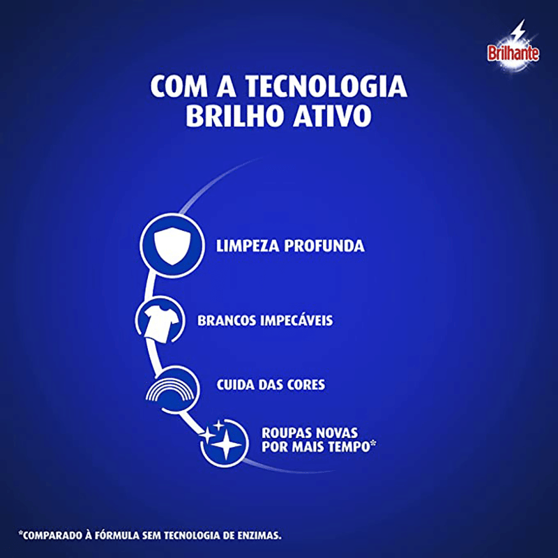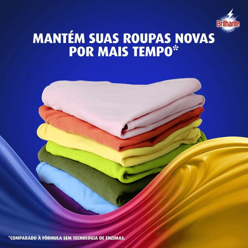 • O Sabão em Pó Brilhante Limpeza Total permite a blindagem das cores, deixando-as muito mais vivas e impactantes • Este detergente lava roupas em pó para tecidos e roupas possui a tecnologia Brilho Ativo, mantendo o colorido das roupas por muito mais tempo • Este lava-roupas em pó evita o amarelamento dos tecidos, deixando os brancos impecáveis • Brilhante Limpeza Total, com sua nova fórmula que além de higienizar suas roupas profundamente, as protege cuidando das cores • O Sabão em Pó Brilhante ajuda a prevenir sinais de desgaste, mantendo suas roupas novas por mais tempo* • Este detergente garante uma limpeza profunda desde a primeira lavagem A nova fórmula do Sabão em Pó Brilhante Limpeza Total combina os melhores resultados de limpeza com o cuidado dos tecidos: de um lado, o poder das enzimas, que proporciona uma limpeza profunda ao mesmo tempo que evita que a sujeira volte a se depositar nas roupas; do outro, a tecnologia Brilho Ativo que evita o amarelamento das roupas brancas e mantém os coloridos mais vivos. O Lava-Roupas em Pó Brilhante Limpeza Total limpa profundamente suas roupas sem agredir os tecidos, ajudando a prevenir os sinais de desgaste das suas peças preferidas após cada lavagem, além de permitir a blindagem das cores, deixando-as muito mais vivas e impactantes. Entre limpeza profunda e blindagem da cor? Escolha os dois! Com Brilhante, você sempre leva mais com a solução completa! Brilhante limpa as suas roupas brancas e coloridas enquanto cuida das cores. É um ativo concentrado poderoso. Brilhante quer se tornar um aliado nas tarefas diárias de seus consumidores e busca trazer praticidade com produtos inovadores e que todo mundo possa usar, diminuindo o peso das tarefas e liberando tempo para as demais atividades do dia a dia. Acesse o nosso website para saber mais. *Comparado à fórmula sem tecnologia de enzimas.