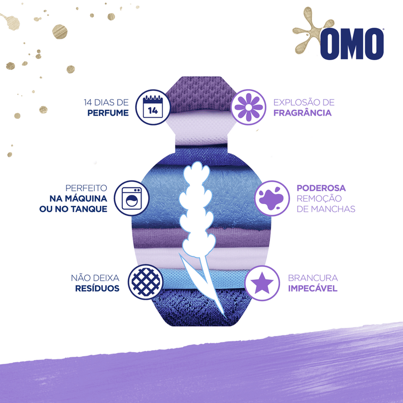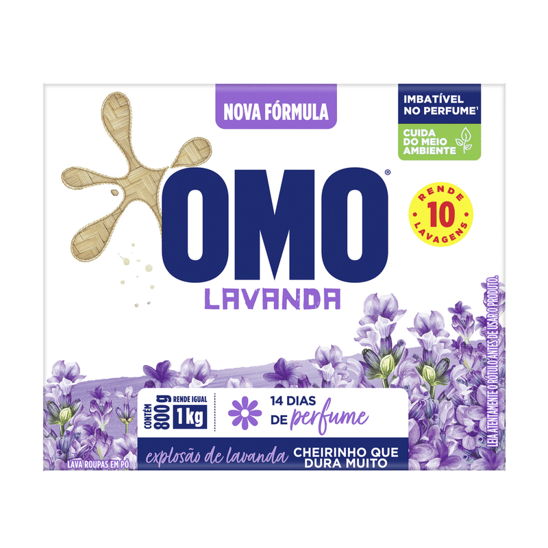 • O Sabão em Pó OMO Edição Especial Lavanda é imbatível no perfume* e cuida do meio ambiente • Esse lava roupas promove uma explosão de fragrância, com perfume de lavanda que dura até 14 dias! • Com ele, sua lavagem de roupa vai trazer uma brancura impecável e um cheirinho que dura muito • O Sabão em Pó OMO Edição Especial Lavanda é perfeito na máquina e no tanque • Não deixa resíduos que danificam as roupas • Sabão em pó que tira manchas na primeira lavagem O Sabão em Pó OMO Edição Especial Lavanda traz sensação de tranquilidade e de relaxamento. OMO Lavanda possui em sua fórmula um perfume exclusivo de lavanda que dura 14 dias. Seu pó ultrafino possui rápida dissolução, não deixando resíduos que danificam as roupas durante as lavagens, tira manchas de primeira, brancura imbatível, e cuida das cores e dos tecidos. Além de todo esse poder e cuidado com as suas roupas, o Sabão em Pó OMO Edição Especial Lavanda se preocupa com o meio ambiente. Sua fórmula contém ingredientes biodegradáveis e não possui fosfato, ajudando a preservar rios e oceanos, e economiza água, pois precisa de apenas 1 enxágue*. Com OMO Lavanda apenas meia xícara (240 ml) para lavar uma máquina cheia. Seu uso é recomendado por Brastemp e Consul. Para saber mais sobre a linha de produtos OMO, OMO Tira Manchas e OMO Desinfetantes, acesse o site. Mantenha o produto fora do alcance de crianças e dos animais domésticos. Leia o rótulo antes de usar o produto. *Reduzindo de 2 ou mais enxágues para apenas 1.