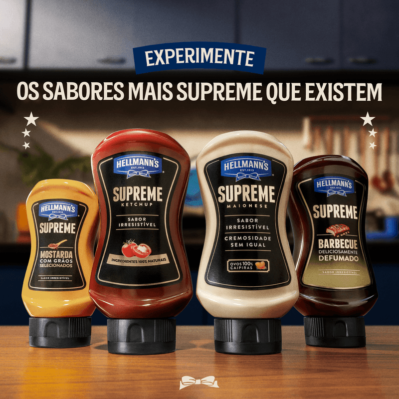 • Maionese Hellmann's Supreme 330g: cremosidade e sabor irresistível. Feita pra quem tem o molho. • Feita com ovos 100% caipiras. Não contém glúten. • Embalagem bisnaga moderna e prática para dosar na medida certa, sem desperdício. • Frascos 100% recicláveis e feitos a partir de materiais reciclados, ajudando a cuidar do planeta enquanto leva mais sabor para a sua mesa. • Textura extra cremosa, ideal para hambúrgueres premium, sanduíches especiais, wraps, molhos e acompanhamentos. A Maionese Hellmann's Supreme 330g oferece cremosidade e sabor irresistível para quem não abre mão do melhor. Feita com ovos 100% de galinhas caipiras e ingredientes cuidadosamente selecionados, garante textura extra cremosa, perfeita para acompanhar hambúrgueres, petiscos, sanduíches, lanches e muito mais. Sem glúten, cada porção traz qualidade superior e sabor autêntico. A embalagem bisnaga moderna e prática permite dosar na medida certa, facilitando o uso no dia a dia. Com frascos 100% recicláveis, Hellmann's Supreme ajuda você a cuidar do planeta enquanto leva mais sabor para a sua mesa. É a escolha ideal para transformar receitas simples em experiências gastronômicas memoráveis, com a qualidade premium que só ovos caipiras podem proporcionar. Maionese Hellmann's Supreme. Pra quem tem o molho.