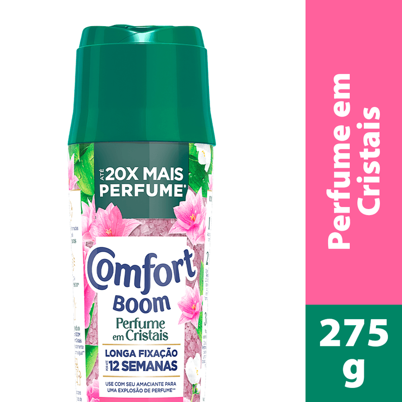 • Use Comfort Boom Perfume em Cristais Euforia Floral junto com seu amaciante para criar uma fragrância irresistível em cada lavagem, sem deixar resíduos • Comfort Boom mantém suas roupas perfumadas por até 12 semanas e oferece até 20x mais perfume e 20x mais frescor *Teste analítico de Comfort amaciante concentrado + Comfort Boom Perfume em cristais comparado com marca diluída, sem perfume encapsulado, do mesmo fabricante • Adequado para todos os tipos de máquinas e tecidos, o Perfume em Cristais Euforia Floral se dissolve completamente para penetra profundamente nas suas roupas *Seguir o modo de uso do produto descrito na embalagem • Dê às suas roupas um toque extra de perfume, com a fórmula em cristais que libera uma fragrância deliciosa e duradoura durante o ciclo de lavagem • Fácil de usar: adicione Comfort Boom Perfume em Cristais Euforia Floral na máquina e sinta a mágica acontecer Conheça o Comfort Boom, o mais novo perfume para roupas que transforma cada lavagem em uma experiência intensa de perfumação. Feito para quem ama fragrâncias sofisticadas e duradouras, o Comfort Boom Euforia Floral é um perfume em cristais desenvolvido para fixar nas roupas por até 12 semanas. Basta adicionar Comfort Boom Euforia Floral na sua máquina de lavar, com o amaciante da sua preferência, e desfrutar de roupas cheirosas, envolvidas por uma fragrância marcante e um BOOM de frescor. Experimente uma verdadeira experiência sensorial com Comfort Boom Euforia Floral.